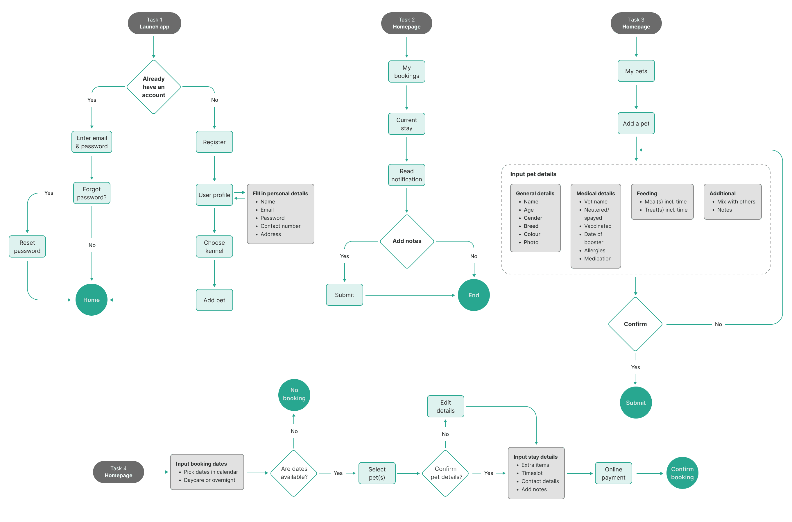 The main task is making a booking and setting up a profile by adding dogs along with important information about medication, food, and dietaries etc. When making a booking, you can see the availability and and pay online in advance.