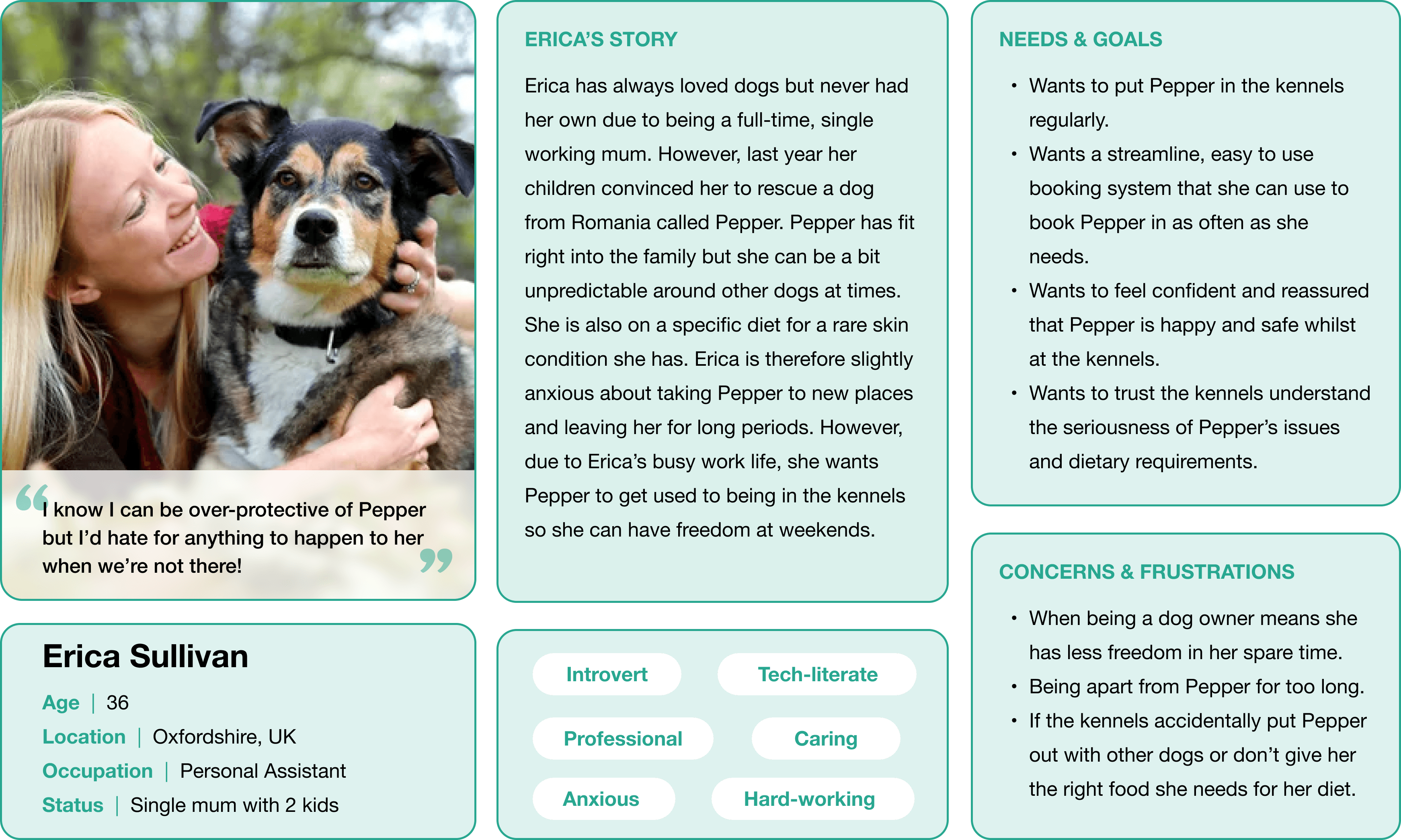 From my interviews, I identified collective thoughts, behaviours and pain points from the user groups I am designing for. This helped me create personas, such as Erica; the anxious dog owner.